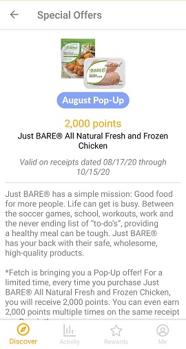 Fetch Rewards has a new special offer where you’ll earn 2,000 points for every purchase of Just BARE chicken!