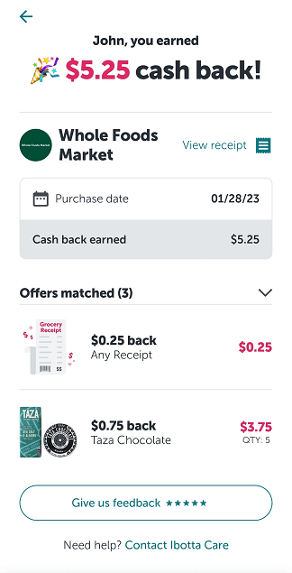 The primary way to earn cashback is to redeem offers from popular brands. For example, on a recent shopping trip to Whole Foods, I earned 25¢ for scanning a receipt, $3.75 for Taza Chocolate bars (75¢ each X 5), and $1.25 for Dave’s Killer Bread for a total of $5.25 in cashback: