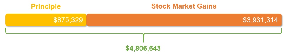 As you can see from the chart below, you’re only investing $875,329 over the entire 36 years. The rest of $4,806,643 comes from stock market gains and the beauty of compounding: