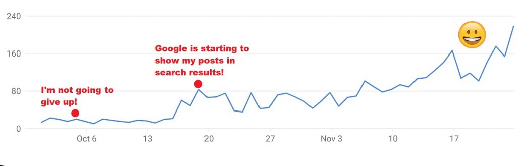 Once bloggers show that theyโre here to stay for the long haul (by consistently posting and posting things people find value in), Google will slowly reward them with search engine visitor traffic: