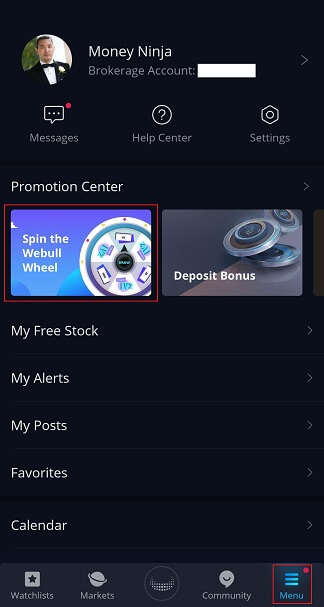 You can check the status of your promotion (including any prizes you’ve won) by clicking the ‘Menu’ icon on the bottom right-hand corner of the app. You should see a bright blue box with the words “Spin the Webull Wheel”:
