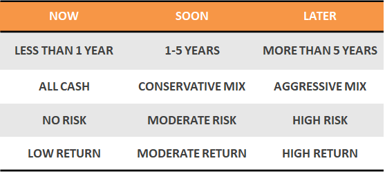 Money you need now or money you might need soon could be for things like an emergency fund (a rainy day fund for unexpected expenses), vacations you’re planning to go on soon, or a big purchase that’s coming up a few months from now.